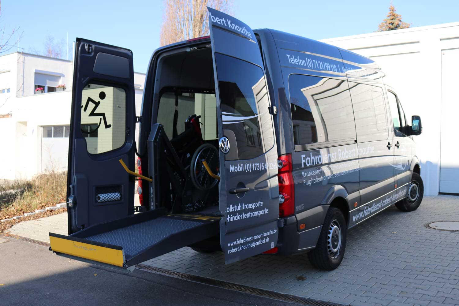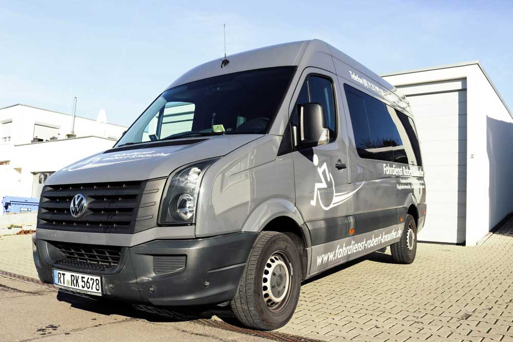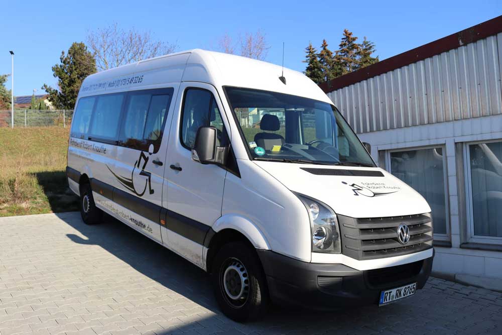 Unser Fuhrpark besteht aus VW Craftern, VW T 6 Bussen und Caddys. Alle Rollstuhlfahrzeuge sind mit einer ausklappbaren Auffahrrampe ausgestattet. Somit kann der Rollstuhl direkt ins Fahrzeug geschoben werden und mit einem Drei-Punkt Gurtsystem befestigt werden.
